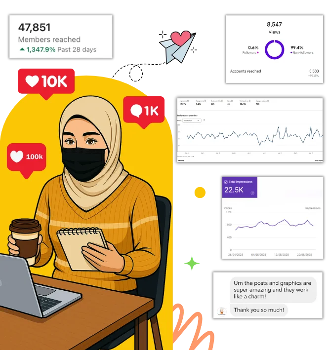 I specialize in creating standout designs, written articles and captions, increasing engagement, and generating sales through social media and websites. With a solid background in Social Media design and Content Strategy, I’ve helped clients boost sales and grow their audience. My own content reached 22k impressions in just 28 days is a proof that my strategies work.